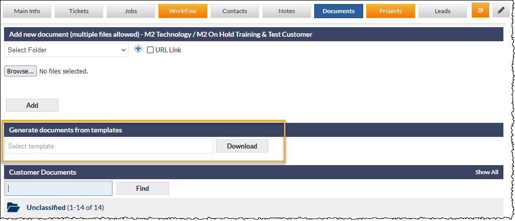 Documents can be generated either from a customer's Documents tab or from any screen that has a Related and Upload Documents field (for example, Leads, Tickets, Jobs, Projects):