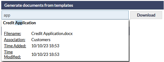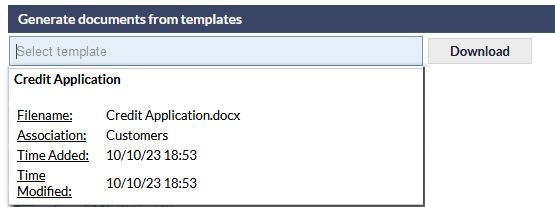Using a predefined template, a new Word document can be generated automatically from most modules in CommTrak, by simply selecting the required template and pressing the Download button.