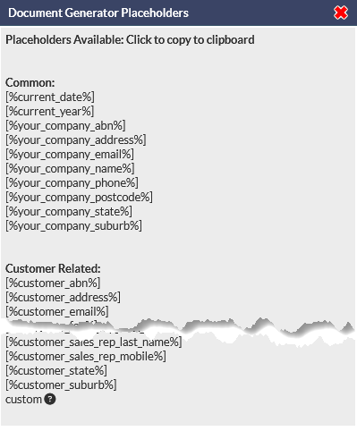 As noted in the pop-up window, clicking a placeholder will copy it to the clipboard, so it can easily be pasted into the Word document that will be used for the template. Only relevant placeholders will be displayed in the pop-up window. For example, if the template has been associated with the Jobs module, in addition to the generally-available placeholders, Jobs-related placeholders will also be listed.