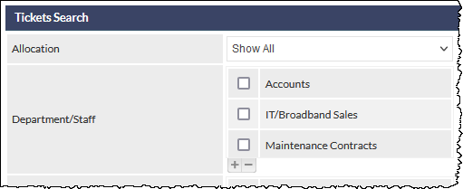 In addition to the above Allocation criterion, multiple Ticket Departments and Staff can be selected to further refine the search.