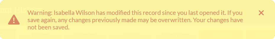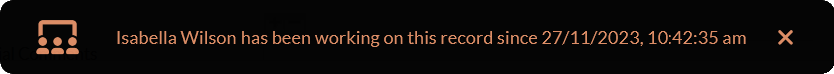 - A user can dismiss the notification by pressing the close (X) icon in the alert. The alert will not be displayed again for the currently-open record unless the other user leaves and reopens the record, or another user subsequently opens the record