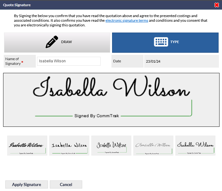 Contacts can now electronically sign quotes via a unique quote link. This feature is designed to facilitate a quicker and more streamlined approval process for quotes, improving the overall efficiency of transactions. The integration of electronic signatures within CommTrak ensures a verifiable method for obtaining customer consent and approval.