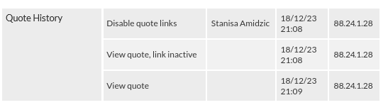 The Quote History section displays the relevant quote activity (if any):
