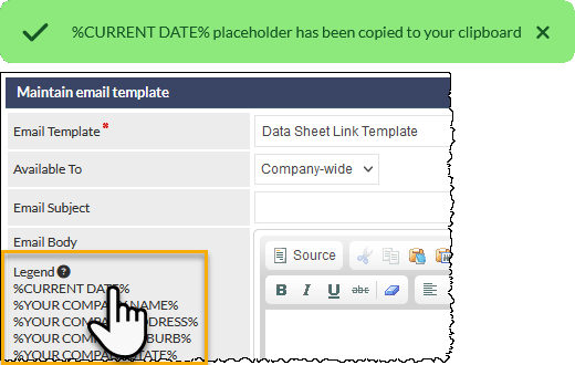 When creating or editing email templates within CommTrak, the available placeholders (shown in the Legend) can now be copied to the clipboard by clicking the required item: