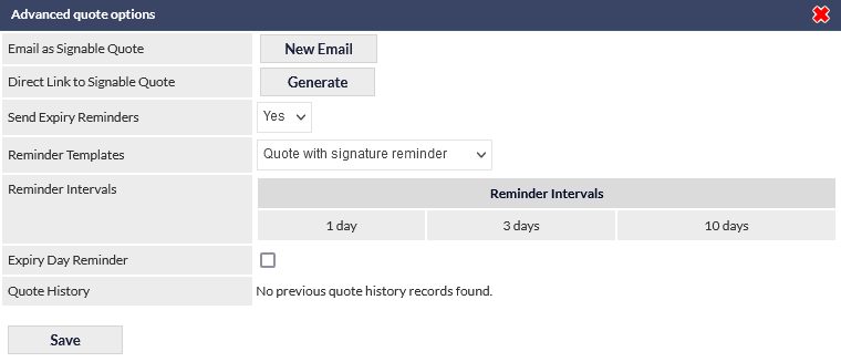 When ticked, the Expiry Day Reminder option (visible in the previous image) will send a reminder on the day the Quote is due to expire, regardless of any other reminders that have been sent.