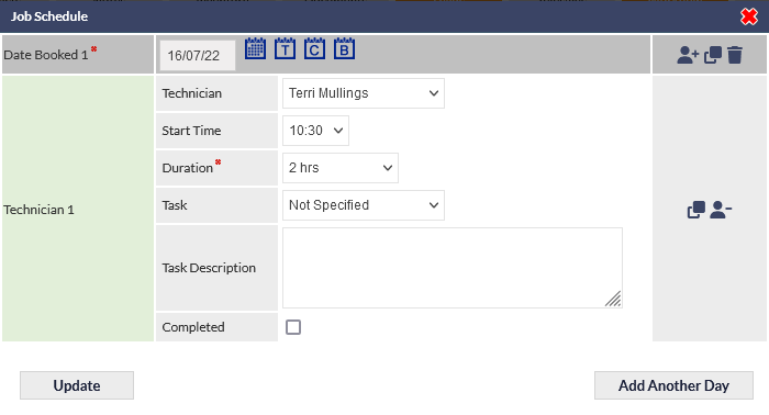 As a result of feedback from our users, we have modified the behaviour of the Update button so that it updates the schedule field and immediately saves any changes made to the Job.