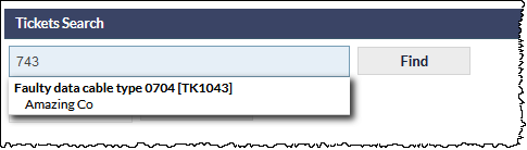In the following image, the text 743 has been entered into the Search field. In this example, for which there is only one result, there is no highlighted text. This indicates that the matching characters have been found in either the Ticket Description or within the text of a Ticket Note: