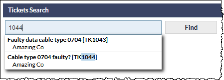 In the next example image, the text 1044 has been entered into the Search field. There are two results; in the first result there is no highlighted text, indicating that the matching characters have been found in either the Ticket Description or within the text of a Ticket Note. In the second the result, the Ticket ID matches the search characters: