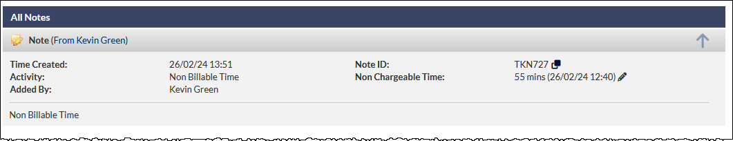 When the Note is Saved, the activity information is included in the Note header:
