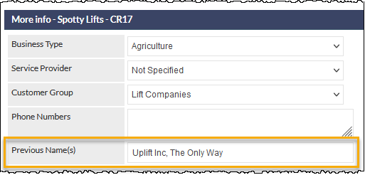 This practical enhancement to the customer profile provides a field for the purpose of recording previous names of a customer, or names by which they are also known.