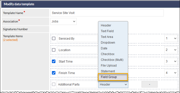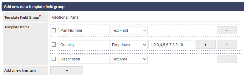 Once a Field Group has been created, it can be added to all new and existing Data Templates. To add a Field Group to a Data Template, add a new line item, enter a name for the Field Group section, and select the Field Group option in the dropdown list: