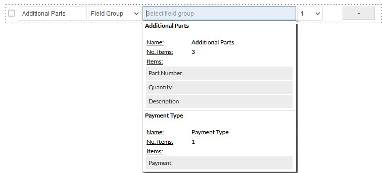 Additionally, (in this example) the number of additional parts required for the repair cannot be known at the time the Data Sheet is designed, so the field group can be configured such that the person who is completing the data sheet can simply add more Additional Parts field groups as required: