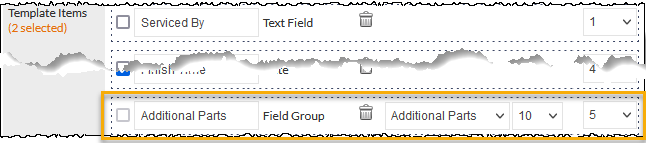 In the previous image, the Additional Parts field group has been specified in the same way that a standard field is specified. In this example, the dropdown field containing the number 10 represents the maximum number of times that the Field Group can be duplicated by the user of the data sheet.