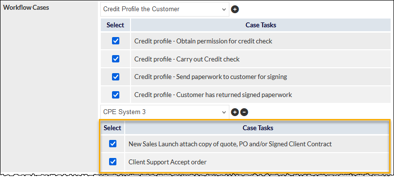 To add another Workflow Case to the Lead, press the plus (+) icon adjacent to the Workflow Group dropdown list (visible in the previous image). An additional Workflow Cases dropdown list is displayed below the Case Tasks for the first Workflow Case: