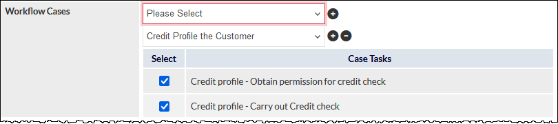 In this example, if only one Workflow Case is required, the first dropdown list must be populated with the required Workflow Group and the second item (currently populated) must be deleted by pressing the minus (-) icon.