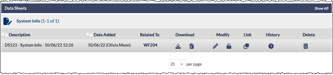 Once added, the data sheet is added to the relevant data sheet folder (for example, System Info in the following image):