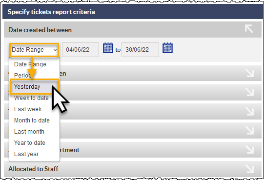 The following image shows this new option being selected in the Tickets > Date created between criterion, but this option is available in all reports where a data range of yesterday is relevant: