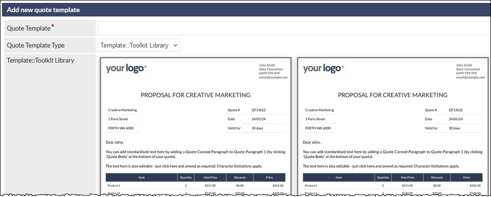 When creating a new Quote Template in Settings > Leads Settings > Quote Templates, you can select a template from the Template Toolkit Library by choosing the Template::Toolkit Library option: