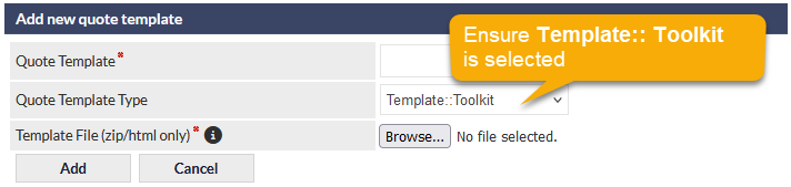 Enter a Quote Template name, and select Template::Toolkit Library: