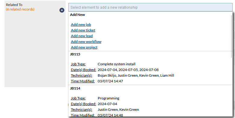 Furthermore, a single record can be linked to multiple records across different modules. For instance, a Workflow might be related to a Lead, several Jobs, and multiple Tickets.