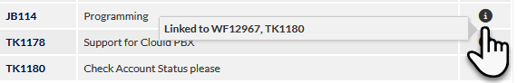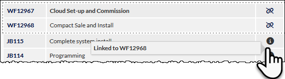 Indirectly related records - the information icon is displayed. Hovering over the information icon displays a pop-up tip explaining the relationship. For example, in the following image of the Related To field for a Lead, hovering over the information icon for JB115, displays Linked to WF12968. We can see in the image that WF12968 is directly linked to the current Lead (because it's within the dotted border and has an unrelate icon). If we need to unrelate JB115 from the current Lead, we can click the link for WF12968 and unrelate the job in that record.