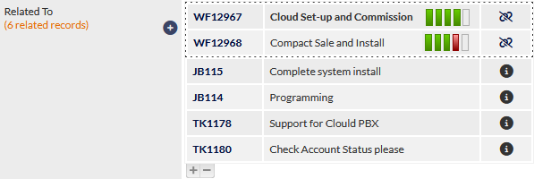 As shown in the previous image, when a Worflow case is displayed in the Related To field, coloured workflow progress indicators are displayed. Hovering the mouse over a task indicator displays the name of the task in a tooltip (not visible in the previous image).