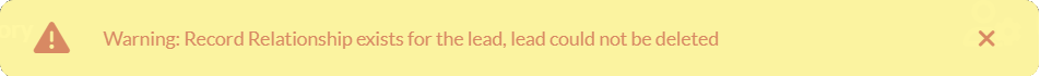 If you attempt to delete an item that is related to other items, you may see a message advising "Warning: Record Relationship exists for the item, the item could not be deleted", as shown in the following example image which is shown when attempting to delete a Lead that is related to other items: