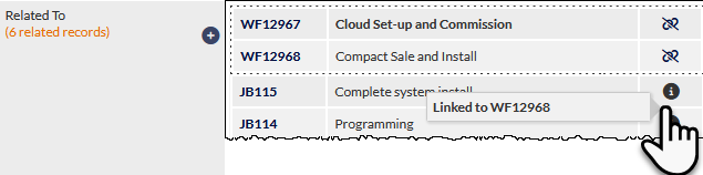 Records within the dotted border (visible in the previous image) are directly related to the current record. Records listed below the dotted border are indirectly related. For example, in the previous image, the two Workflow cases are directly related to the current record, and the two Jobs are indirectly related and must therefore be directly related to a record in the dotted area.