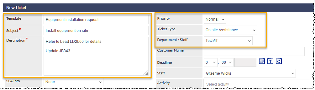 Clicking on the required template in the list will automatically populate the Ticket fields as specified in the Ticket Template Settings. For example, selecting the Equipment installation request template (visible in the previous image) has populated the required fields, as shown in the following image: