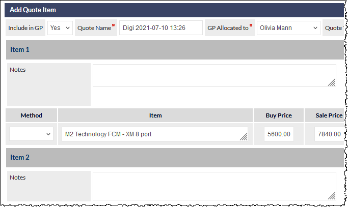 As can be seen in the previous image, the sections for Item 1 and Item 2 can easily been seen, especially when scrolling through a quote with many items.