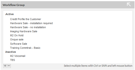 It may be desirable to report on deleted Workflow Groups when there are still active Workflow Cases of that type, or for historical analysis. When viewing the Workflow Group criterion in the Workflow Report, there is an Active and Inactive section (visible in the following image):