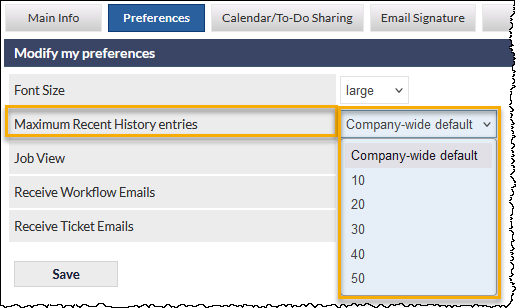 We have added a user preference to enable users to specify the maximum number of Recent History entries. Previously, this was only configurable as a company-wide setting.