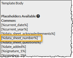 When editing a data sheet, all available placeholders are listed in the Placeholders Available legend under the Template Body label (visible in the following image). Clicking on a placeholder in the legend copies the placeholder into the clipboard so that it can easily be pasted into the template.