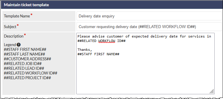 The above image shows the ##RELATED WORKFLOW ID## placeholder being used in both the Subject and the Description. In addition the first name of the staff member who creates the ticket will be used in the message sign-off.