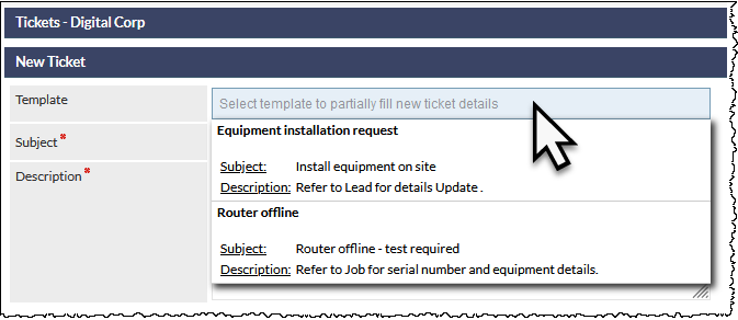 The Ticket Templates feature enables the creation of templates that can be selected when adding a new Ticket. This feature is useful when similar Tickets are created frequently, allowing for the pre-population of many Ticket fields.