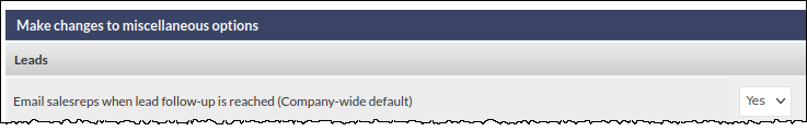 Settings > Leads > Miscellaneous > Email salesreps when lead follow-up is reached (Company-wide default):