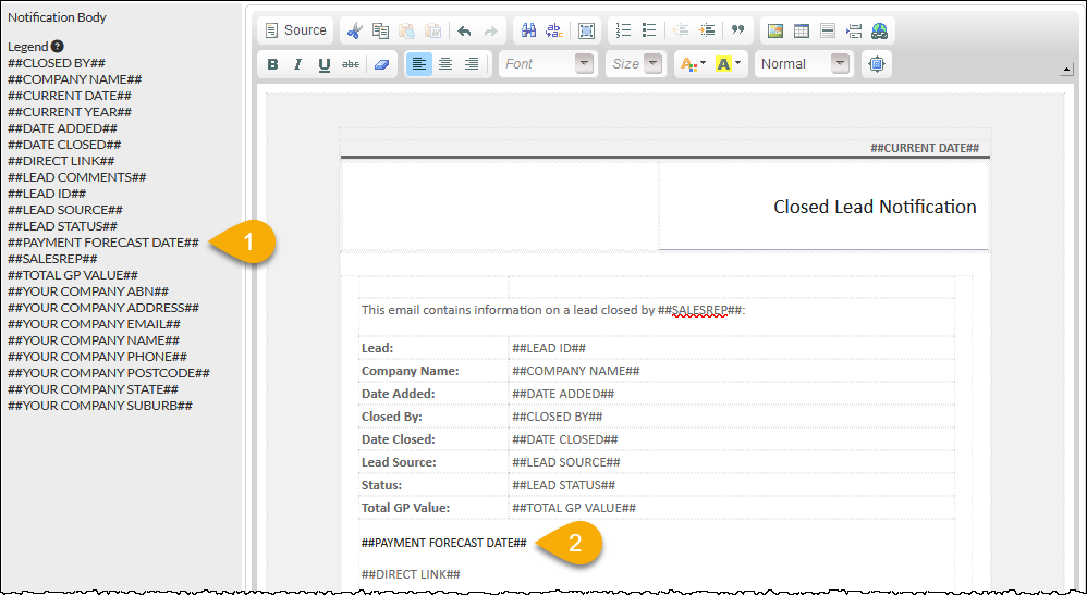 This enhancement can be used to provide the payment forecast date (specified in the Lead) to staff who receive Lead Closed Email Notifications.