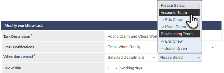 In the following image, a Workflow Task has been selected in the Workflow Settings, and the Selected Department option in the When due, remind dropdown list has been chosen... a dropdown list provides for assigning the department (or a staff member within a department) to the task: