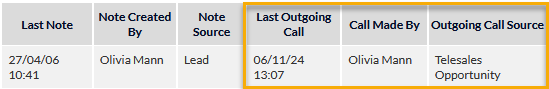 The following image shows and extract of a Customers Report which includes the Call Made By and Outgoing Call Source for Telesales calls: