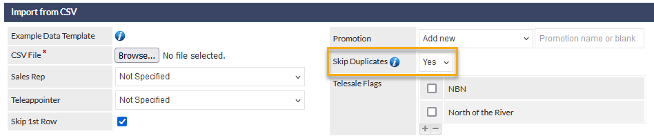 Duplicate detection is based on Promotion Name; if the Skip Duplicates option is set to Yes and an opportunity with same promotion name is found for the same customer or master telesales record, it will not be imported.