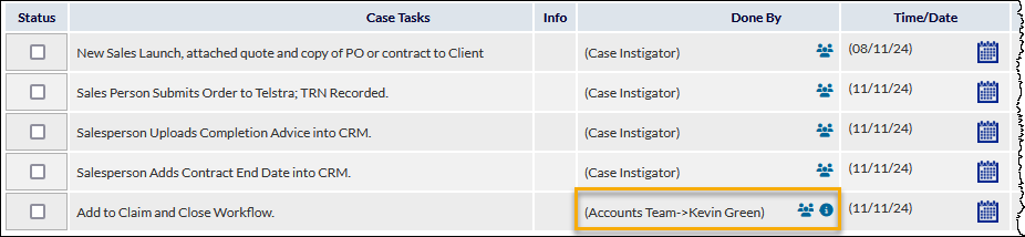 When a Workflow Task is reassigned, an information icon (adjacent to the reassignment icon) is displayed indicating that at least one reassignment has been applied to the task. The following image shows that the task has been reassigned to Kevin Green in the Accounts Team: