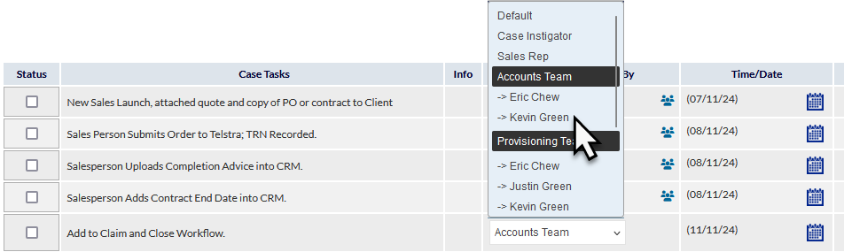 Pressing the Reassign Task icon (highlighted in the previous image), allows for the selection of a different staff member or Workflow Department.