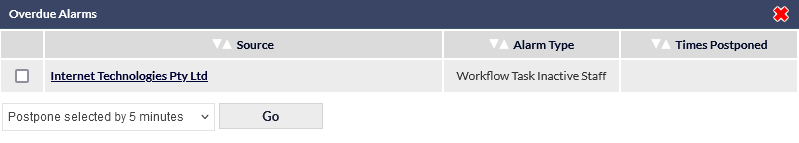 The previous image shows the Overdue Alarms pop-up window, with details of a Workflow Task Inactive Staff alarm.