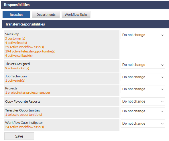 To complete the reassignment of responsibilities press the Save button. The reassignment is immediate - no further prompt or warning is provided.