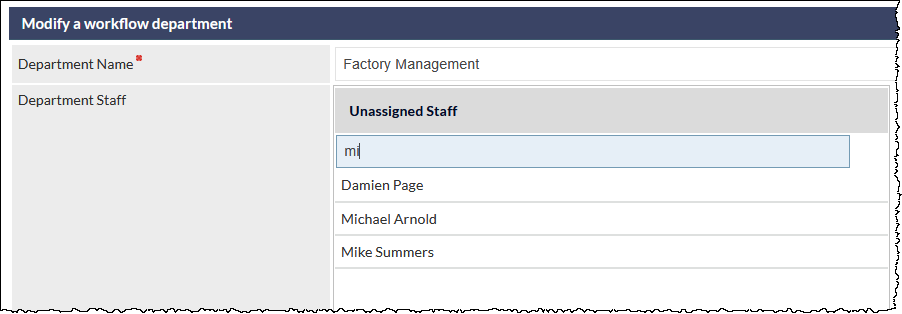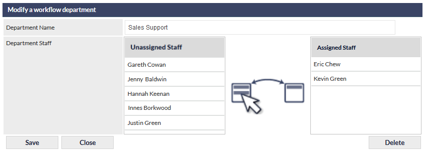 To add staff to the department, drag a name in the staff list on the left (unassigned staff), and drop it into the staff list on the right (assigned staff).
