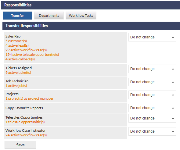 Where a task is assigned to the user, another staff member can be selected from the dropdown list in the Transfer Responsibilities column. The default is Do not change.