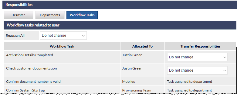 Where a task is assigned to a department of which the currently assigned user is a member, the Transfer Responsibilities column specifies Task assigned to department. This aids in identifying that the Workflow Department may need updating.