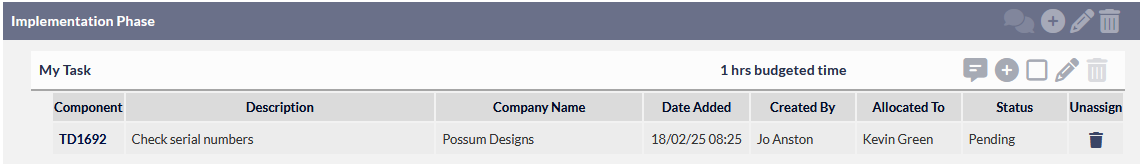 Within a Project, the related To-Do can be unassigned by pressing the trash can icon (visible in the following image of a Project Task):