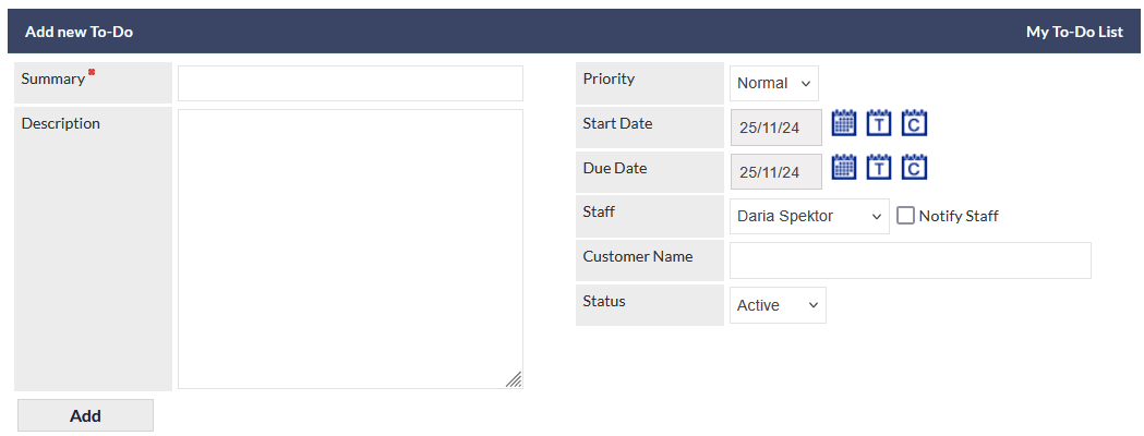 If a staff name other than the current user is selected, the Notify Staff checkbox is displayed. Tick the checkbox to send the staff member an email notification when the To-Do is added.