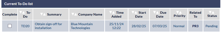 The To-Do item in the previous image includes a link to a Project in the Related To column (PR3 in this example) . This indicates that the To-Do item was created from with a Project.